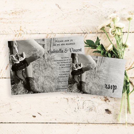 Passen Sie die bezaubernde Cowgirl und Sunflowers Country Wedding UAWG Response Card mit dem Eheantwort-Datum für Ihre lässigen und dennoch eleganten Ranch Themennuptials an. Diese rustikale, schicke Hochzeitskarte zeigt ein malerisches, landschaftliches Foto einer Braut im Landhausstil mit einem Hochzeitskleid aus Weiß und Leder-Western-Cowboy-Stiefeln, die einen Blumenstrauß tragen, der sich an einem Stacheldrahtzaun aus Holz lehnt. Das altmodische Gefühl wurde durch einen Sepia-Ton verstärkt. Perfekte Inspiration für eine feierliche Ehe und Empfang im Party.