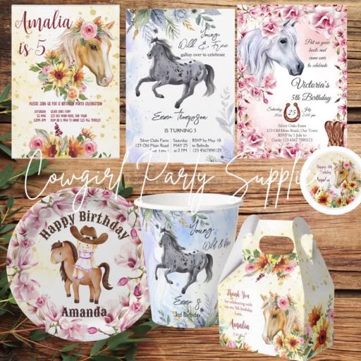 Niedliches kleines Cowgirl Sattel bis zum Geburtstag danke Ihnen für Tags. Cowgirl reiten niedliches Babypferd mit Ballons und bunten Fahnen im Hintergrund. Braune und rosa gelbe Bauernfarben.