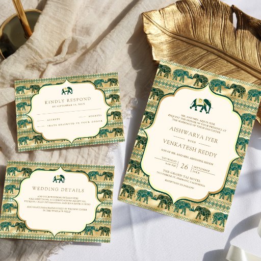 Cream Emerald Gold Elephant Indian Wedding Foto Save The Date
