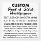 Maßgeschneiderte Texturierte Vinyl Peel und Stick Wallpaper (2' x 12' Rolle) leere Vorlage. Design, eigene Tapete für eine betont akzentuierte Wand oder einen ganzen Raum, 2' breite Rollen mit fünf Rollen-Optionen bis zu 12' Länge sowie eine Testuhr. Machen Sie Ihre ganz individuelle Anwendung glatter Vinyl oder texturierte Vinyl Tapete zu schaffen, um einen einzigartigen Wohnraum, Kinderzimmer oder Kinderzimmer themed Tapete, maßgeschneiderte Heimdekor oder Branded Retail, Bar, Café, Restaurant, Gastfreundschaft oder Büro-Umgebung. Diese individuell gestaltete, hochwertige Tapete ist für eine einfache Reinigung und Wartung konzipiert und macht die perfekte, individuell gestaltete Dekoration für Weihnachten, eine Babydusche, Hochzeit, Themenfeier, Firmenfeier oder andere besondere Anlässe. Anpassen durch Hochladen eines Fotos, Logos oder Designs und Hinzufügen von Text. Verwenden Sie die benutzerdefinierte Bearbeitung, um ein Muster mit fünf alternativen Tilingoptionen zu kacheln. Fügen Sie Ihr Logo und Ihr Branding für den geschäftlichen und geschäftlichen Einsatz hinzu.