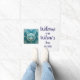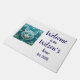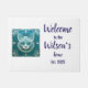 Weiße Türmchen mit einer aquamarinen, blauen Katzenfliese, inspiriert von Jugendstil-Fliesen, personalisiert mit Ihrem Familiennamen und dem Datum der Einrichtung. Perfekt als Geschenk für ein Party, das sich im Haus aufwärmt.