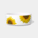 Maßgeschneiderte Blumenschale mit gelber Sonnenblume auf weißem Hintergrund. Mit schwarzer Schrift können Sie mit Ihrem eigenen Text personalisieren. Ideal, um dem speziellen Hund- oder Katzenzubehör eine Touch hinzuzufügen.