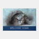 Herzlich willkommen Zuhause zu Ihrer Katze und Familie! Fügen Sie Ihr eigenes Foto Ihrer Katze oder Ihres Kätzchens hinzu. Mit dem Text: Willkommen Zuhause. Weißer Text. Navy Hintergrund.
