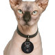 Custom Grim Sensenmann Sphynx Katzenjammer Funny Pet ID-Tag für Katzen. Mit einem realistischen Sphynx Katzengitter-Sensenmann in einem schwarz gehobenen Gewand mit Skeletthänden, die einen Schwanz halten, ein exklusives "Sphynx Cat Art" Design Katzengestalterschild. Füge die Kontaktdaten des Besitzers der Sphynx-Katze auf der Rückseite dieses Identitätsanhängers Katzenkennung und den Namen der Katze auf der Vorderseite hinzu. Ein Muss für jeden Katzenelternteil, falls die haarlose Sphynx Katze oder das Kätzchen entkommt oder sich verirrt.