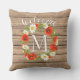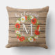 Fun und niedliches Kissen im Freien mit weißen und gelben Daisies und roten Mohn-Blume Kranz, auf einem Vintagen verwitterten aussehenden Bauernhaus-Stil Holzplanken Muster. Mit Raum zum Anpassen oder Personalisieren mit Familie Monogramm oder Initial Ihrer Wahl.