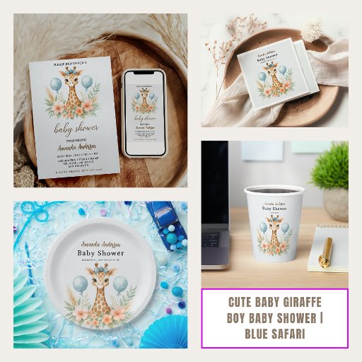 Celebrate your little wild one on the way with this adorable baby giraffe baby shower invitation! Featuring soft watercolor safari vibes, sweet baby blue accents, and the cutest little giraffe, it's perfect for a boy baby shower. Personalize with your details and wow your guests with a charming, modern, and playful theme. Ideal for jungle, safari, and animal-themed baby showers. Let the fun begin—your tiny explorer is almost here!