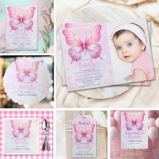 Cute birthday design for girls! Celebrate that little butterfly's birthday with our cute pink birthday butterfly design, perfect for celebrating a girl's birthday of any age. Featuring a pretty pink butterfly with multicolored sparkles, add your birthday details to celebrate that sweet butterfly.