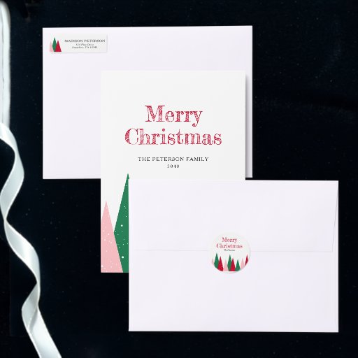 Celebrate the season with this cheerful holiday sticker featuring a trio of cute Christmas trees in red, green, and pink, dusted with soft snowflakes for a whimsical winter touch. The modern design adds a playful twist to tradition.