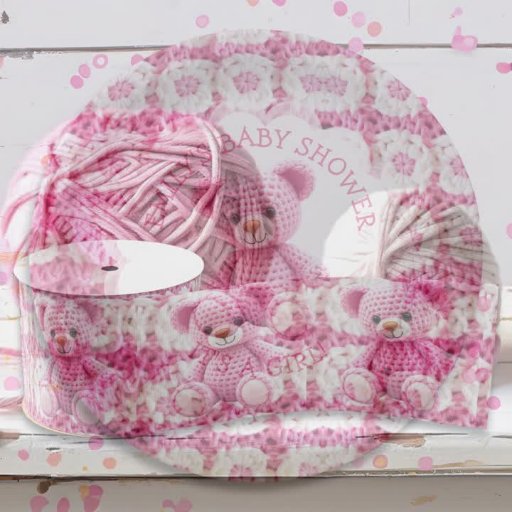 Pink and white crocheted teddy bear girl's baby shower personalized paper plates. An adorable pink teddy bear crocheted with pink and white yarn adds the sweetest touch.