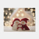 Two cheerful snow parents and their cute little snow child, all wearing matching red winter hats and scarves, soft bokeh lights and a glowing winter home in the background create a cozy, magical Christmas atmosphere.