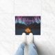 In einem schneebedeckten Tal in einer frostigen Nacht im Winter springt ein Feuer hoch, um die Nordlichter zu spiegeln, die den Himmel über den fernen Bergen füllen.