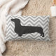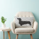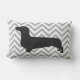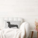 Schwarze Dackel-Silhouette auf einem grauen und weißen Zickzack Musterhintergrund.