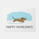 Niedliche Cartoon Dackel Hunde Urlaub Begrüßungsmatte. Der Text "Happy Howlidays" kann mit Ihrem Namen oder Slogan personalisiert werden. Glückliche Cartoon Dackel läuft durch den Schnee. Ein lustiges Tor für die Winterferien-Saison. Ein tolles Weihnachtsgeschenk für Dackeln-Liebhaber.