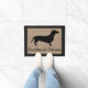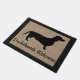 Dackeln begrüßen Fußmatte mit einem Imitatleinwand Druckhintergrund, schwarze Ränder, und ein schwarzes Dackel-Würstchen verfolgen Silhouette.