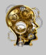 Konzeptioneller, mechanischer, menschlicher Kopf mit antiken Manometer und Metallgetrieben vor grauem industriellem Hintergrund. Steampunkstil.