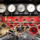 Die Dampfzug-Fahrer schauen von der Fußplatte der Spurweiten und Kontrollen des Zuges aus.