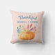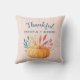 Ein quadratisches Kissen mit Typografie, das sagt: Dankbar gesegnet, perfekt für den Erntedank Saison. Ein Bild eines orangefarbenen Kürbis mit Herbstblättern und Sprigs. Rosa und goldgestreiftes Muster für den Hintergrund.