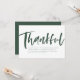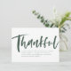 Dieses Erntedank-Dinner-Angebot enthält ein feines Pinselskript "dankbar" in einem reichen Fallschatten des Jägergrün sowie eine moderne Typografie für Ihre Party-Details. Diese Einladung koordiniert mit der Lea Delaveris Design Thankful Erntedank Kollektion.
