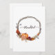 Erntedank Kranz mit Orangenkürbis, Herbst-Blume, Weinreben, Ästen, Trauben, Herbstlaub und Schrift. Orange und Rot Herbst Kalligraphie Abbildung Herbst Saison themed.