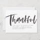Dieses Dinner in Schwarz/Weiß mit einem fett gearbeiteten Pinselskript "dankbar" und moderner Typografie für Ihre Party-Details. Diese Einladung koordiniert mit der Lea Delaveris Design Thankful Erntedank Kollektion. Der Backer ist schwarz gesprenkelt.
