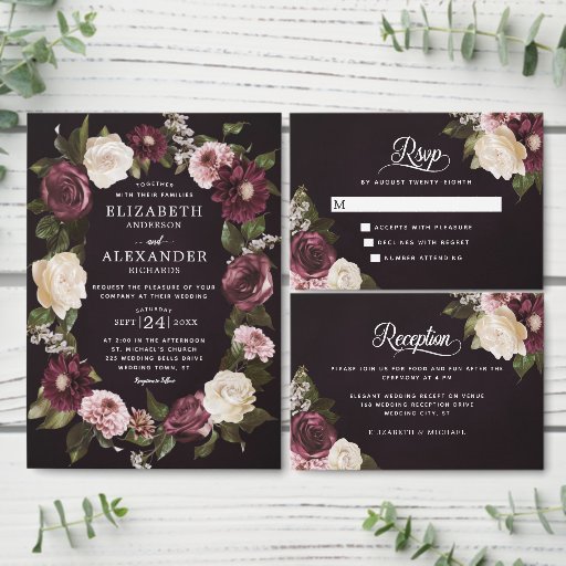 Dark Moody Floral Burgundy Wedding Elegant Folieneinladung