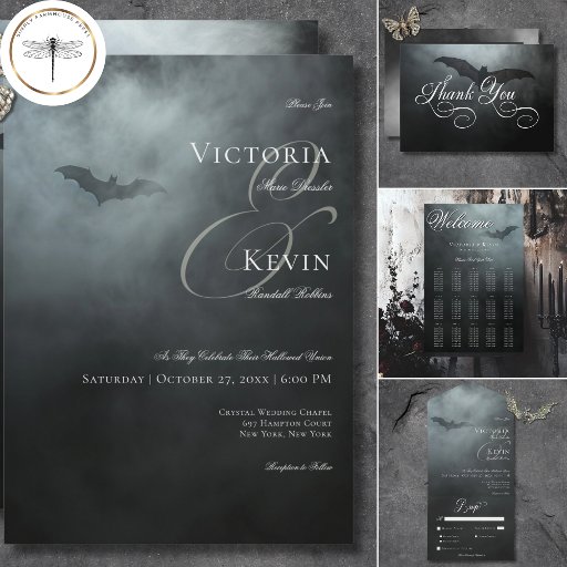 Dark Moody Midnight Bat & Fog QR Code Wedding All In One Einladung