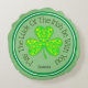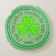 Dieses reizende Design ist auf einem runden Kissen zu sehen. Der Hintergrund ist weich, cremig, grün, mit einem dunkelgrünen und weißen Rahmen. In der Mitte des Designs befindet sich ein neongelbes und grünes Kleeblatt. Der Text lautet "Möge das Glück des Irischen bei dir sein". Das Design ist vorne und hinten am Kissen.