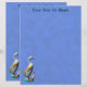Eine gemalte, geschnitzte Holzente mit ihrem Enkeln, stark verwittert, auf blauem Hintergrund. Passen Sie Ihren eigenen Text an.