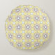 A decorative pillow featuring a symmetrical geometric pattern with blue, white, and brown hues shown from the front and back on a gray background.