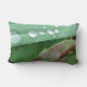 Am oberen Rand dieses amerikanischen MoJo Dekokissens sind einige große Wassertropfen auf einer breiten, grünen Grashalde zu sehen. In der unteren rechten Ecke befindet sich ein rot-brauner Stuhldentenwohnheimer einer Hölzchen.