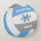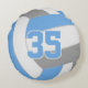 Dieses sportliche Volleyball-Kopfkissen mit einem realistischen Aussehen eines hellblauen, grauen und weißen Volleyballs, auf dem man den Namen des Spielers, Monogramm oder Varsity Letter, den Namen des Teams und des Maskottchens auf der Vorderseite und die Trikotnummer auf der Rückseite - von katz_d_zynes