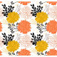 Nahtloses Muster mit Blume, schwarzen Blätter und Zweigen auf weißem Hintergrund. Die Blume sind orange, gelb und weiß. Die Blätter sind schwarz, die Zweige grau. Das Muster wird wiederholt, und die Blume werden in einer zufälligen Reihenfolge angeordnet.