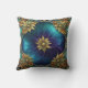 Ein lebendiges Blumenmuster mit aufwändigen goldenen Blume vor türkisfarbenem Hintergrund, das ein elegantes Design mit fließenden Linien und symmetrischen Elementen zeigt.