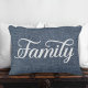 Das Kissen enthält das Wort 'Familie' in einem weißen dekorativen Skript vor einem lässigen blauen Imitat Denim Hintergrund.
