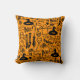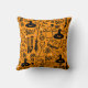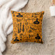 Dekoratives Kissen mit modernem minimalistischem Design zu Halloween, Silhouetten von Besen, Eulen, Spinnennetz, Silhouette einer Katze, Hexe auf orangefarbenem Hintergrund.