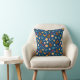 Dekoratives Kissen mit Neujahrsmuster, niedliche Bilder von Bonbons, Lollipops und Lebkuchengebäck, Bogen und Blätter auf blauem Hintergrund.