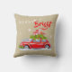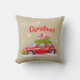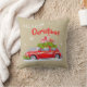 Dekoratives Kissen für frohe Weihnachten, mit einer niedlichen Illustration eines festlich dekorierten Autos mit Tannenzweigen und Kisten mit Geschenken auf dem Dach.