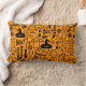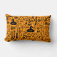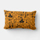 Dekoratives Kissen mit modernem minimalistischem Design zu Halloween, Silhouetten von Besen, Eulen, Spinnennetz, Silhouette einer Katze, Hexe auf orangefarbenem Hintergrund.