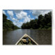 Ein Boot nast einen Fluss im Amazonasdschungel unter puffigen Wolken in einem blauen Himmel hinunter.