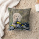 Ein weicher Spielhund als Motorradfahrer in der Natur, ein lustiges Kissen mit zwei verschiedenen Seiten und Bildern