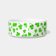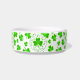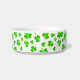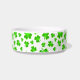 Haben Sie eines St Patrick Tagesfeier für Ihren Hund! Erhalten Sie eine entzückende Haustierschüssel mit einem hellgrünen individuellen Namen des Kleeblatts und Ihres Haustieres mit glücklichen St Patrick Tag und den glücklichen Hund, der in einem runden grünen Rahmen auf einem Kleeblattdruckhintergrund gedruckt wird.