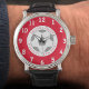 Eine Armbanduhr für den glühenden Fußballfans. Zeigen Sie Ihren eigenen Namen und den Namen des Fußballclubs, den Sie unterstützen. Fußball-Motiv für jeden Fußballfan, der ein Team unterstützt, das rot spielt.