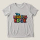 Die digitale Illustration des "Leading Edge"-T - Shirt zeichnet sich durch eine spielerische, lebendige Typografie aus, die ein positives Ambiente einnimmt und die Vorstellung unterstreicht, an der Spitze von Innovation und Kreativität zu stehen. Die Vorderseite zeigt den Begriff "Leading Edge" in fett, bunten Buchstaben, während die Rückseite das Wort "Forefront" anbietet, das dynamische Designs beinhaltet, die ein Gefühl von Bewegung und Inspiration wecken.