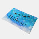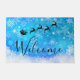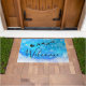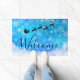 Weihnachtsmatte mit einer schwarzen Silhouette des Weihnachtsmannes, der in seinem Schlitten von seinen Rentieren angezogen wird, die über den Himmel fliegen. Willkommen geschrieben in einem trendigen Skript-Schriftart. Der Hintergrund ist ein eisblau frostiges Schneeflockendesign.