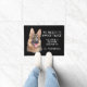 "Es ist nicht nötig zweimal zu klopfen, wir haben einen deutschen Schäferhund" erklärt diese lustige Türmatte. Der Text ist auf der rechten Seite in Weiß, während ein Portrait eines schönen schwarzen und bräunlichen GSD auf der links Seite ist. Alles wird auf schwarzem Hintergrund platziert.