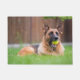 Deutsches Hirtenhundeweibchen mit einem Tiskugel im Mund, das auf Gras sitzt.