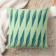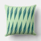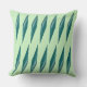 Die Kissenkunst zeigt ein Muster von zyanfarbenen, länglichen, rautenförmigen Formen, die in einem Farbverlauf angeordnet sind, illusionär und dreidimensional rasterartig gegen eine frisch pastellfarbene Tee-grüne Leinwand.