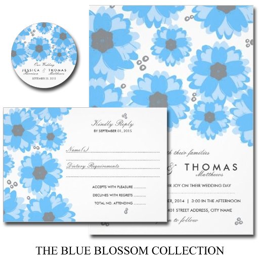 Die Blue Blossom Hochzeitskollektion - Gönnen Sie Stickereien oder Einladungs-Siegel.