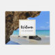 Herzlich willkommen an der Tür mit einem landschaftlichen Naturfoto. Schönes türkisblaues Meer mit einem Sandstrand. Ein großer, brauner Felsen verleiht dem hellblauen Himmel Schatten.