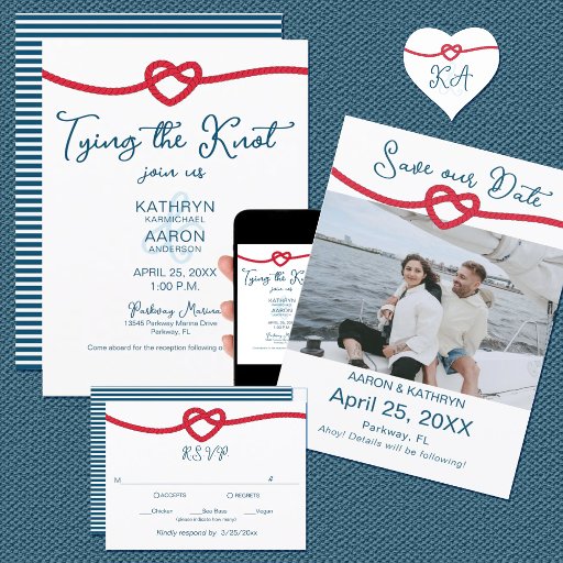 Klassisch, klassisch und lustig nautisch blau auf weiß mit rotem Akzent Herz Seil Design. Passen Sie mit all Ihren personalisierten Informationen an! Auf hellweißem Halbglanzpapier gezeigt, wählen Sie aus einer qualitativ hochwertigen Auswahl von schönen Papieren und einladenden Formen. Karo ergänzender Artikel in der Kollektion The Knot binden! Download-Option verfügbar.